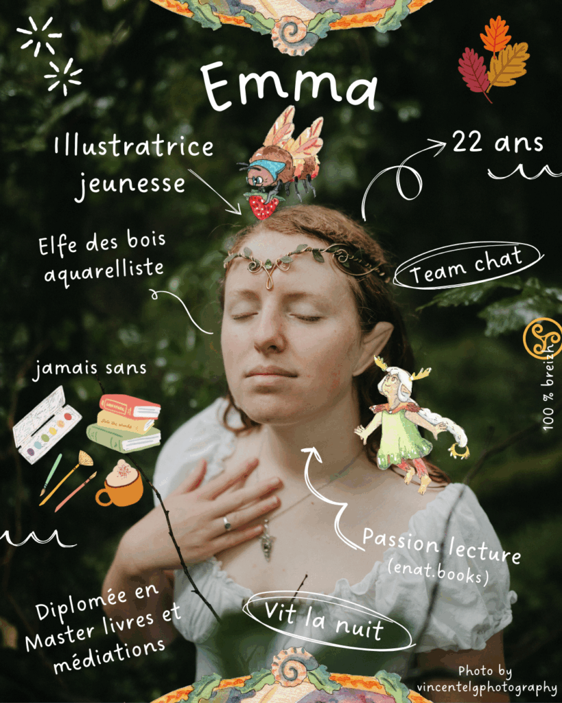 Je m’appelle Emma et je suis originaire du pays des bigoudènes et du beurre salé. Je mets en images et en mots des histoires pour la jeunesse.